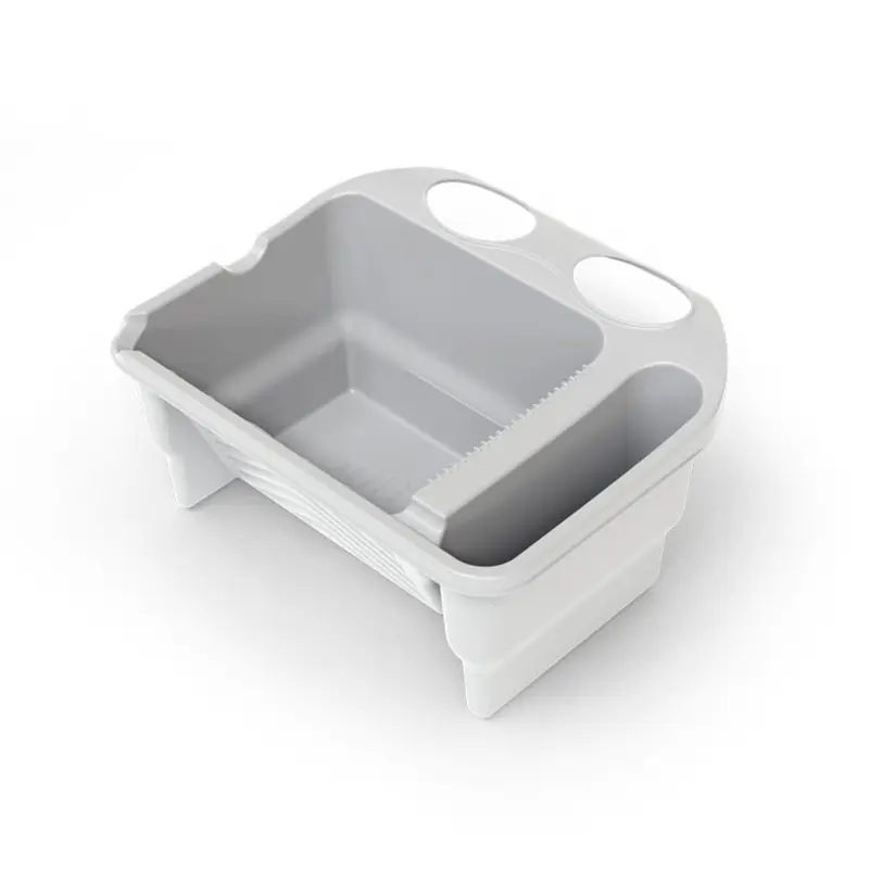 В емкости предусмотрены специальные поверхности для раскатки валиков, очистки инструмента, а также слива избыточной краски. Емкость удобно держать одной рукой при выполнении основных малярных и отделочных операций, в т.ч. на высоте, а также хранить в ней инструменты. Емкость изготовлена из безопасного, прочного пластика, отлично лежит в руке, легко моется и не требует особого ухода.